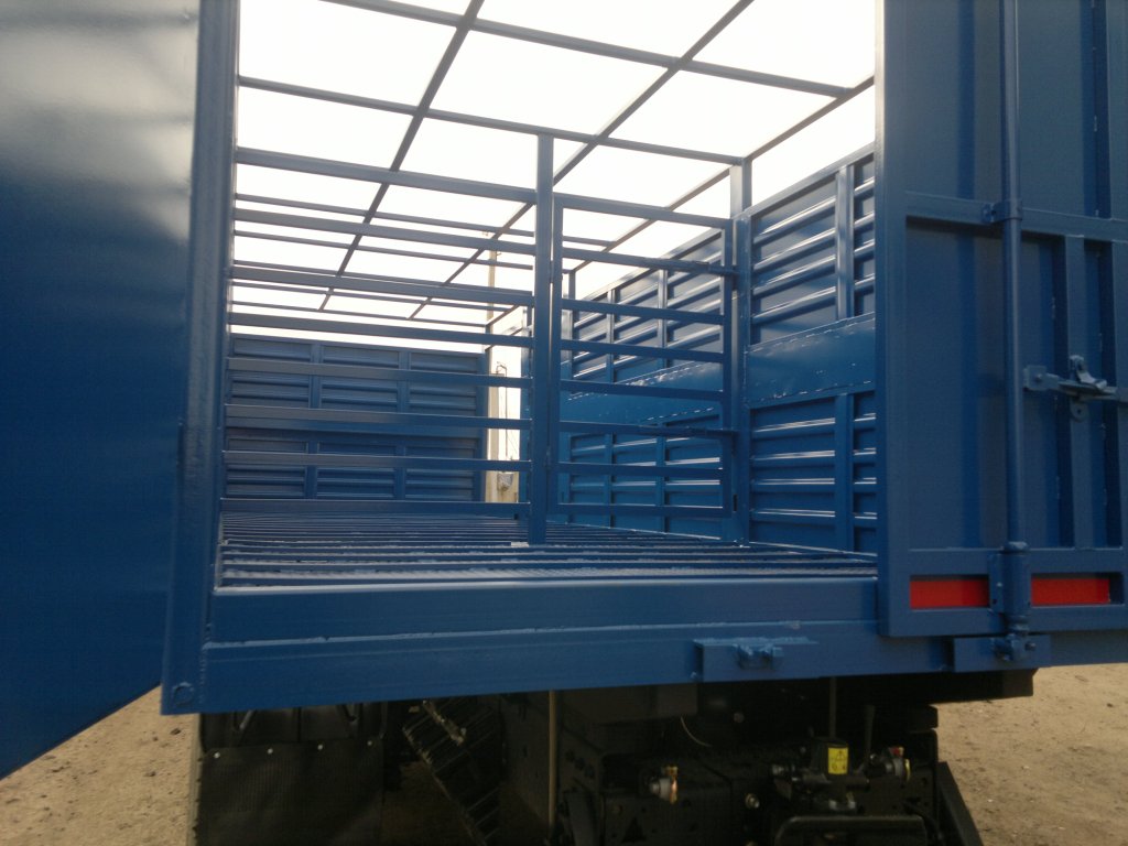 Пол железный рифленый лист, толщина 3мм. Верхняя часть надстройки закрывается накидным пологом с передними, боковыми клапанами для вентиляции кузова. Исполнение задней части: распашные ворота. Внешняя обшивка - крашеный лист, квадратная труба. Пространство внутри скотовоза разделено на помещения. Двери, перегородки изготовлены из металлической трубы. Материал для пола – рифленый стальной лист, смотровая дверь для персонала.